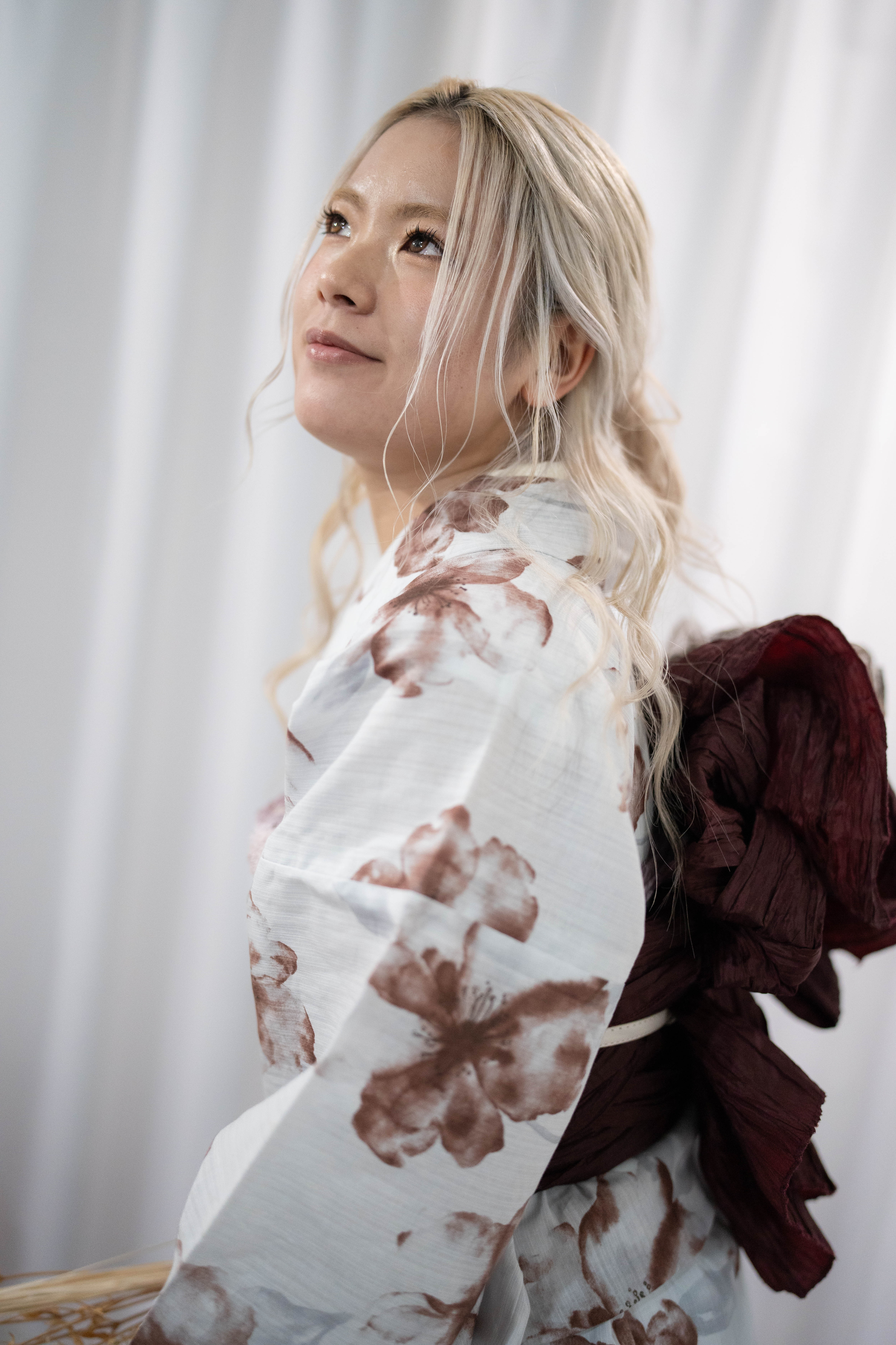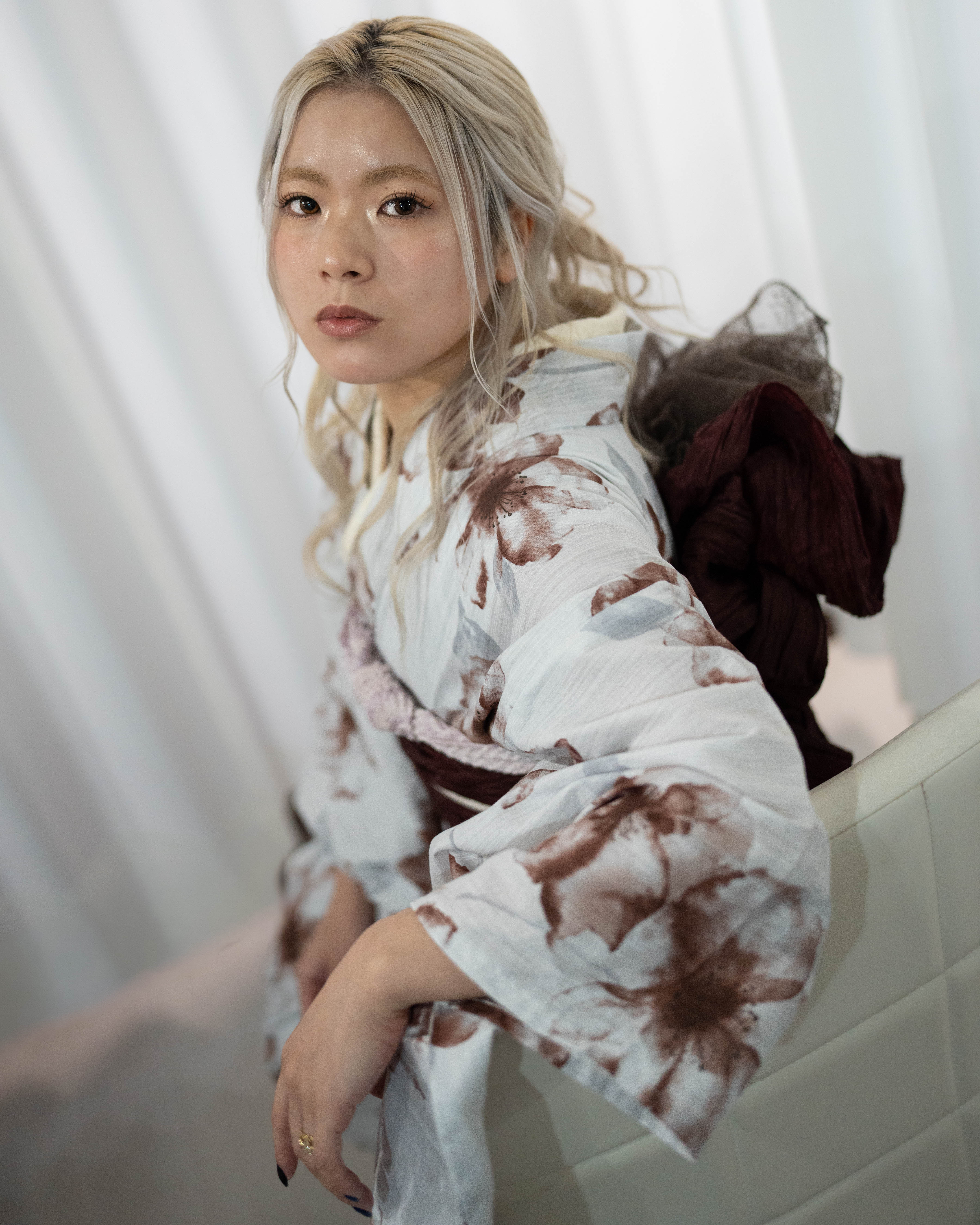 青みを含んだ白地に、くすみブラウンの花が静かに滲む一枚。深いボルドーと透けるレースを重ね、夜の余韻を纏う大人のコーデ。