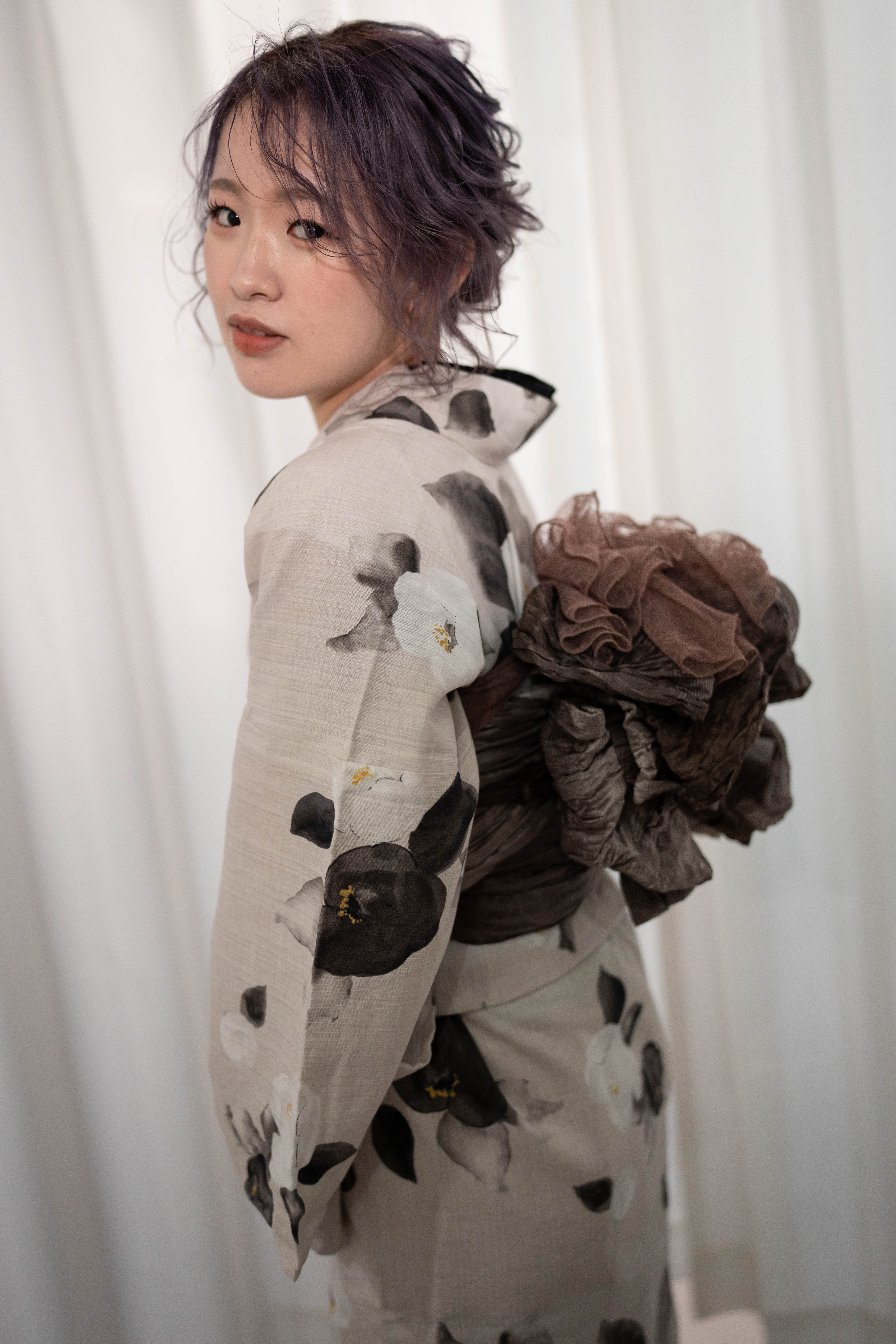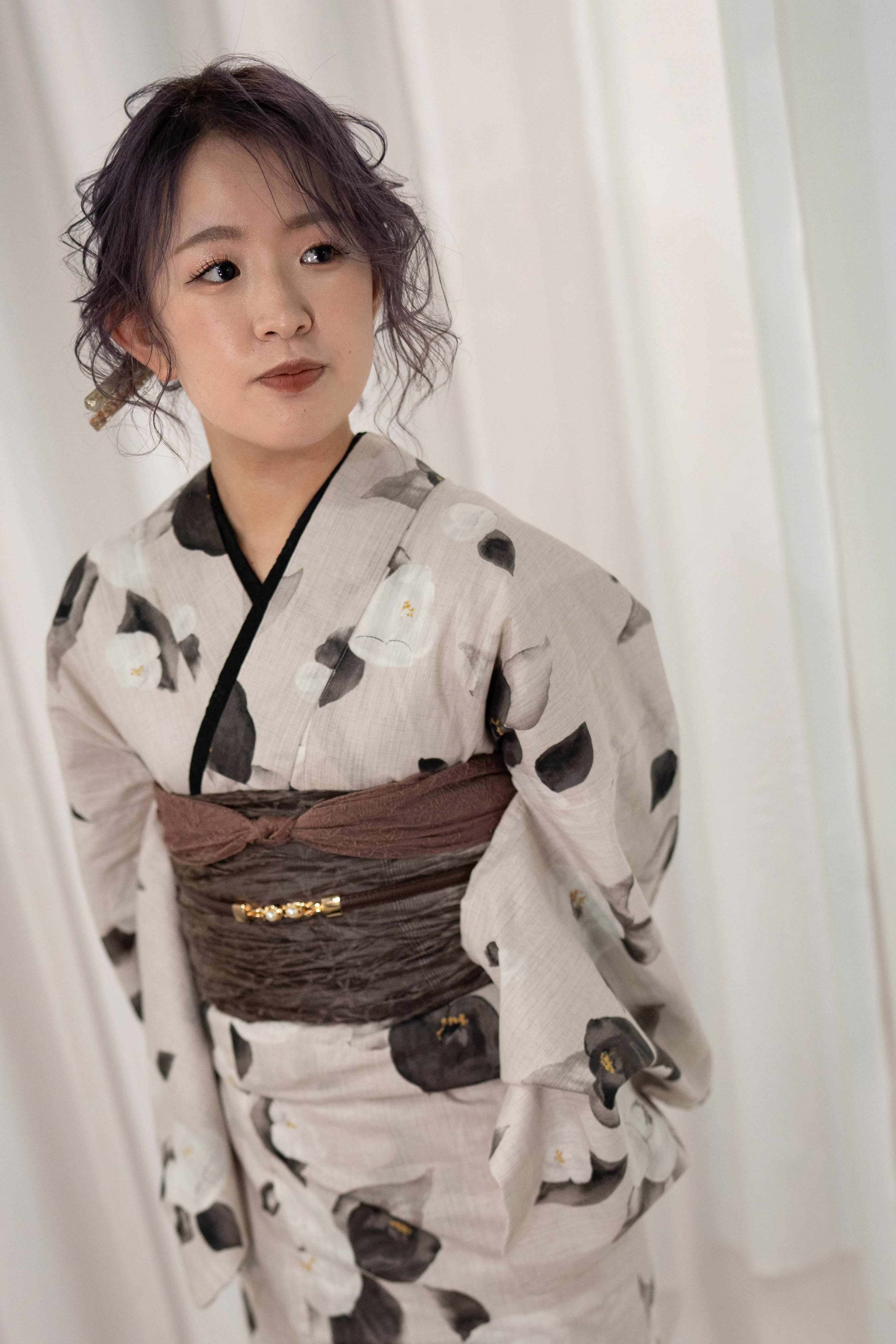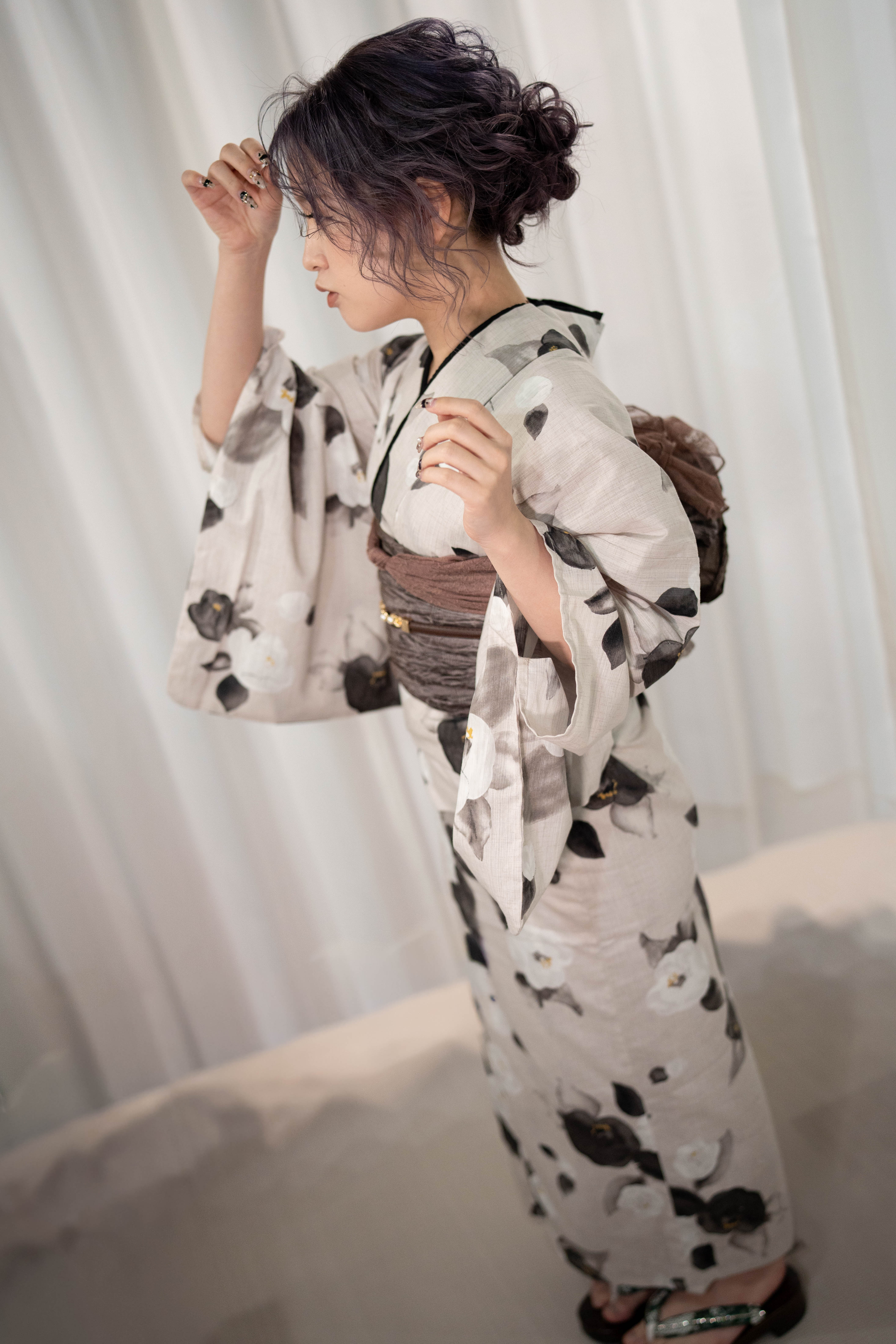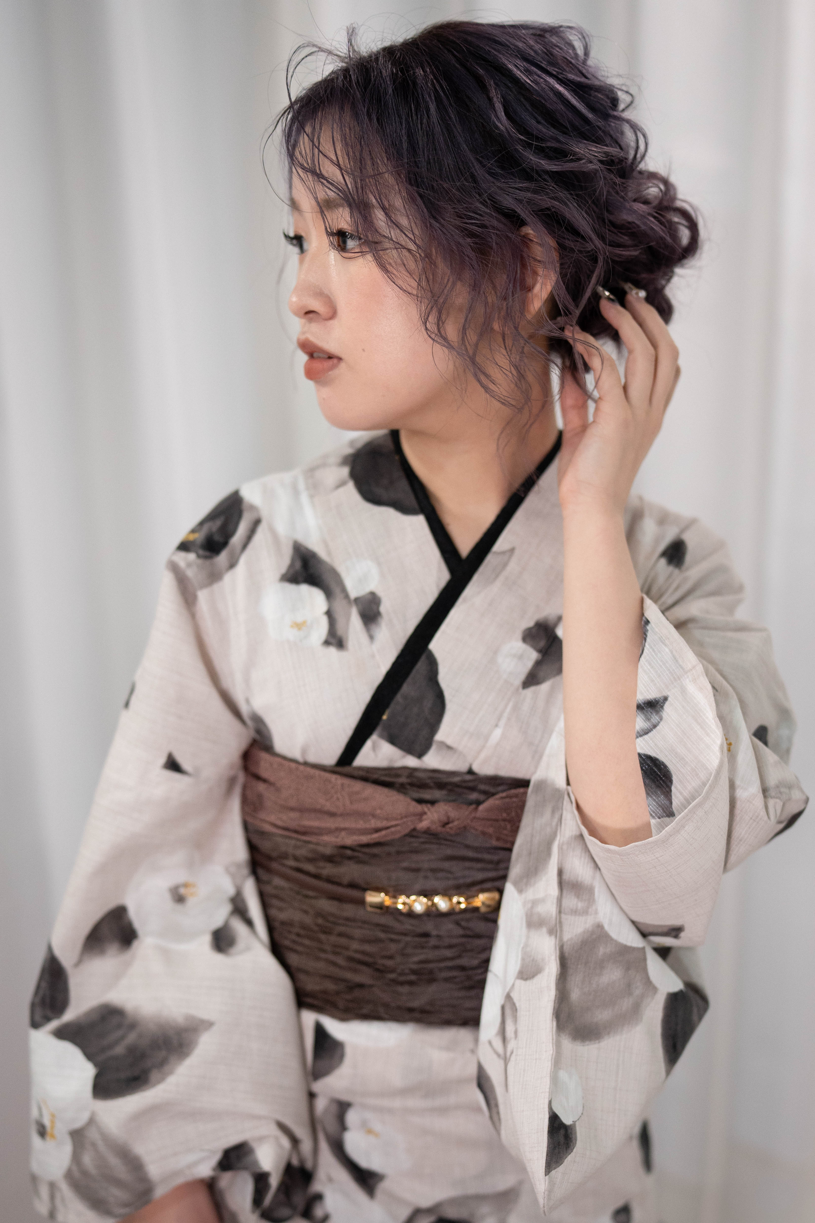 くすんだ生成りに、墨の椿を落とした静かなモード。墨の重ね衿で輪郭を締め、モーブブラウンの帯で奥行きを重ねた、大人浴衣コーデ。