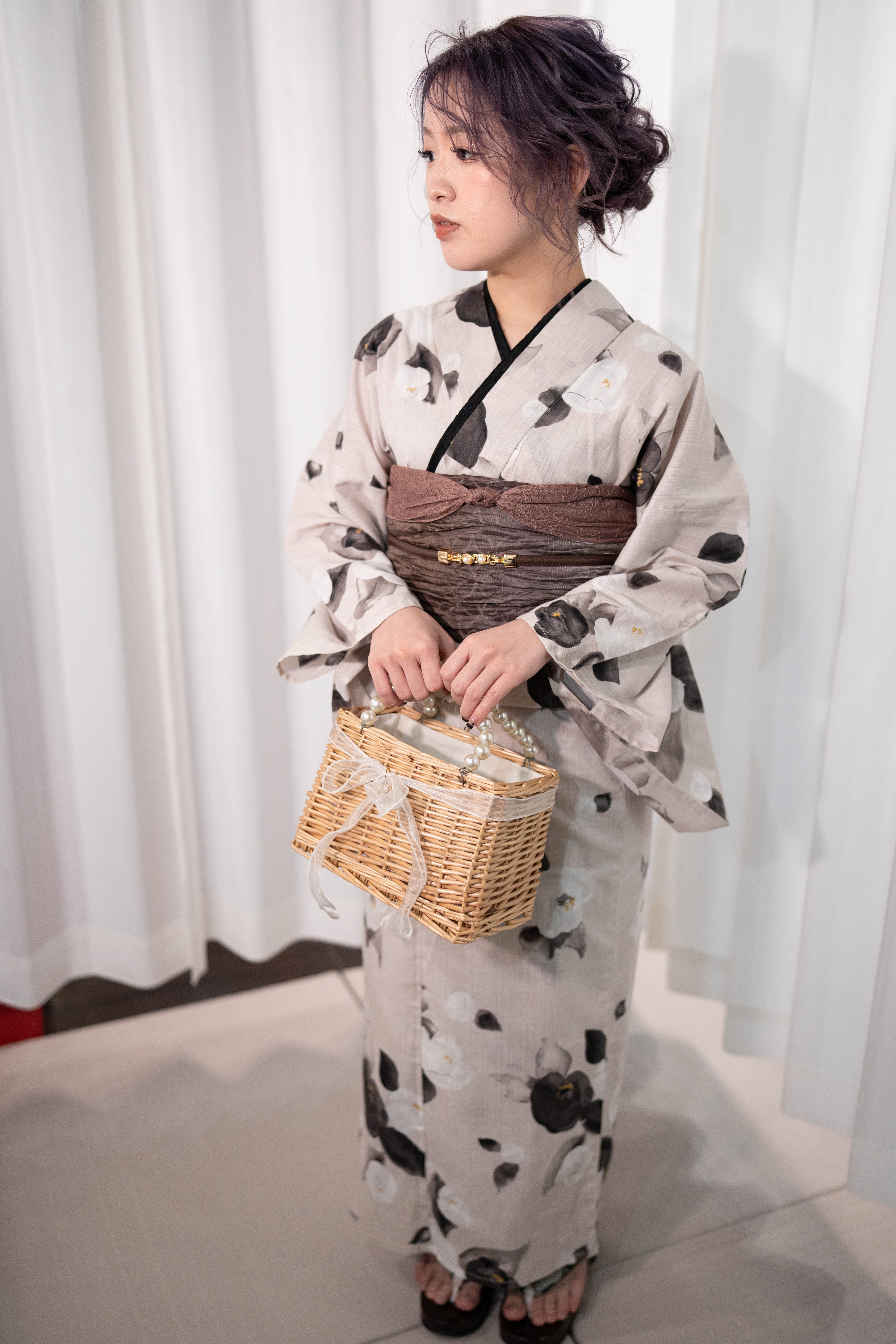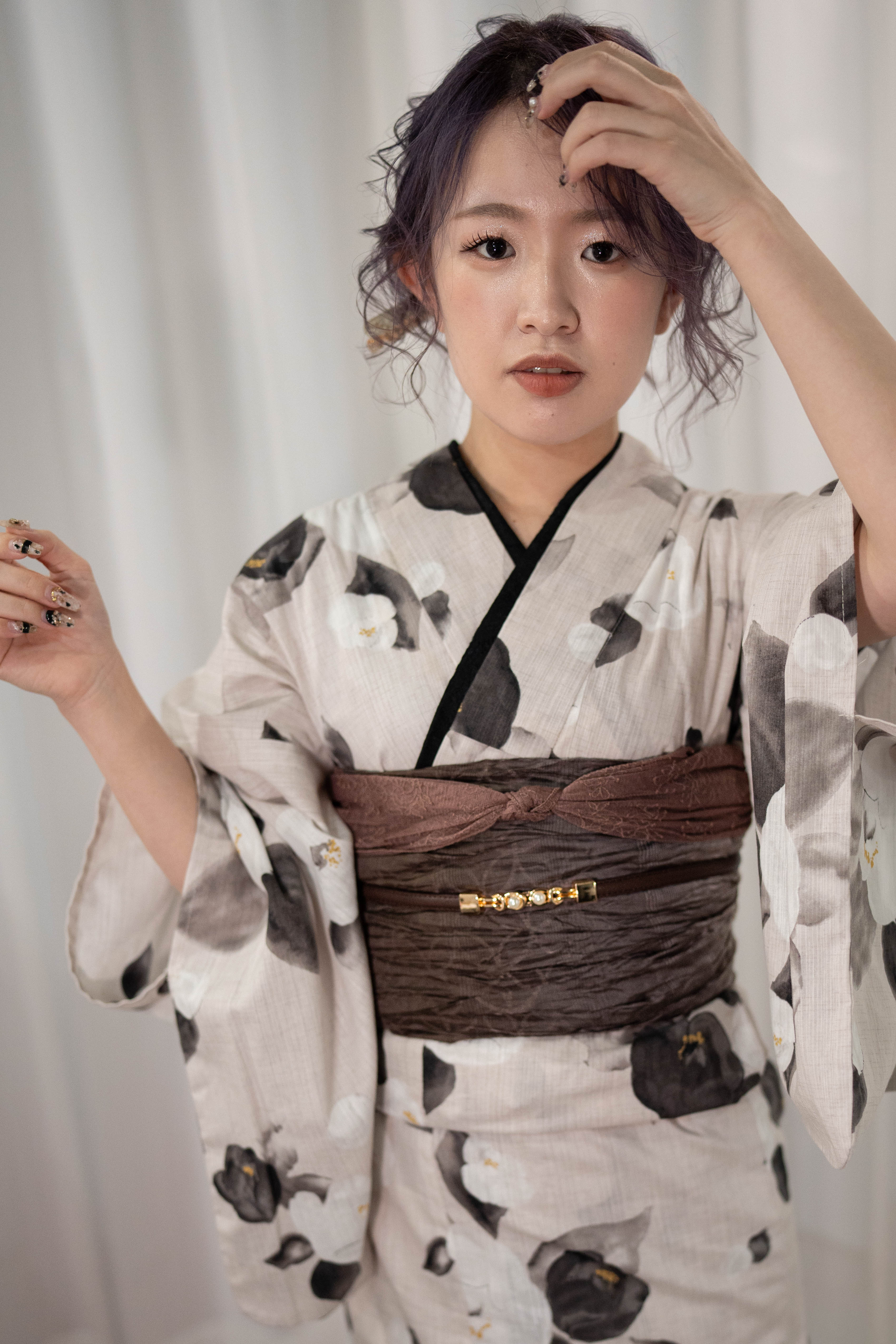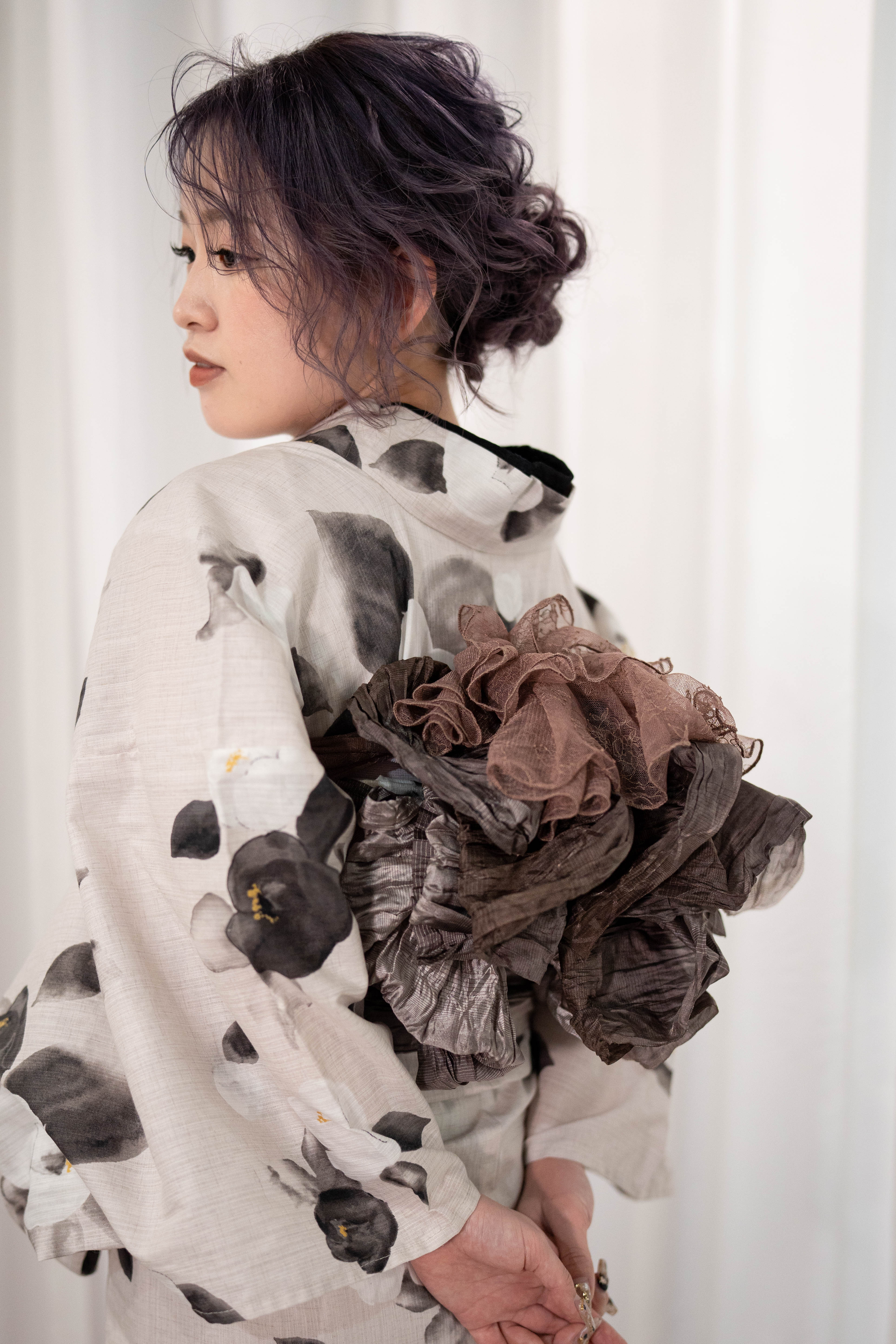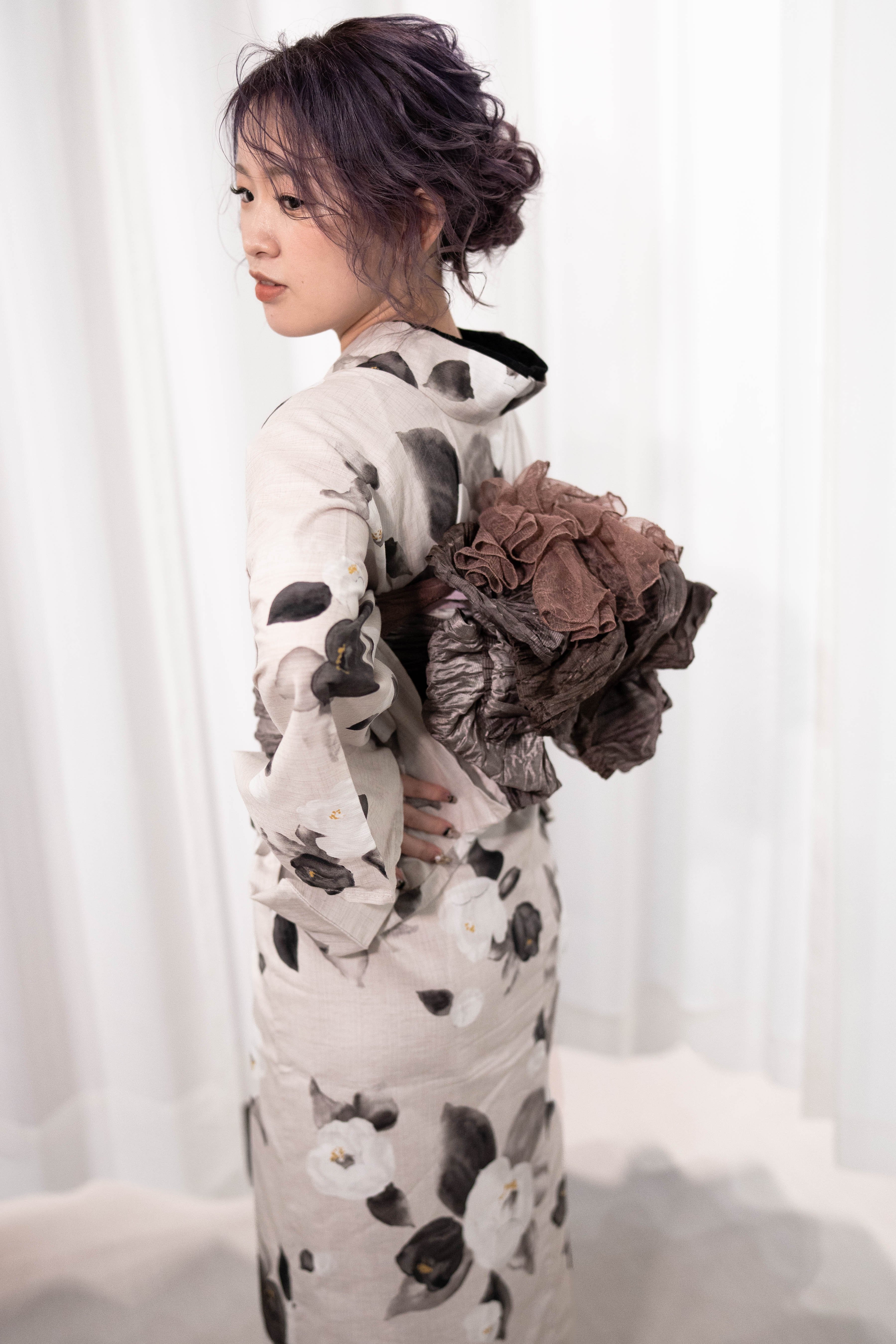 くすんだ生成りに、墨の椿を落とした静かなモード。墨の重ね衿で輪郭を締め、モーブブラウンの帯で奥行きを重ねた、大人浴衣コーデ。
