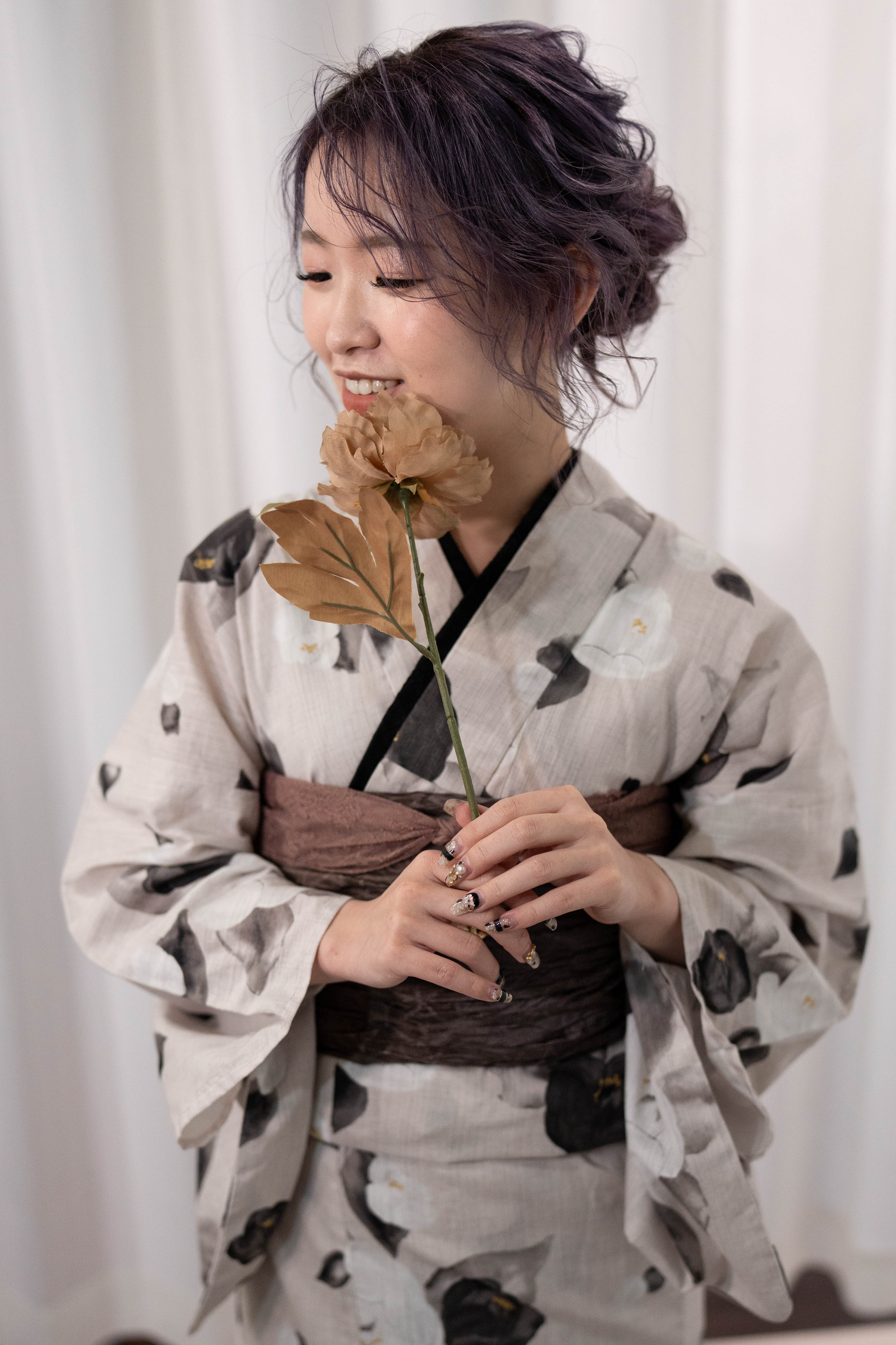 ・浴衣:オフホワイトグレー地 × 墨黒と白の椿