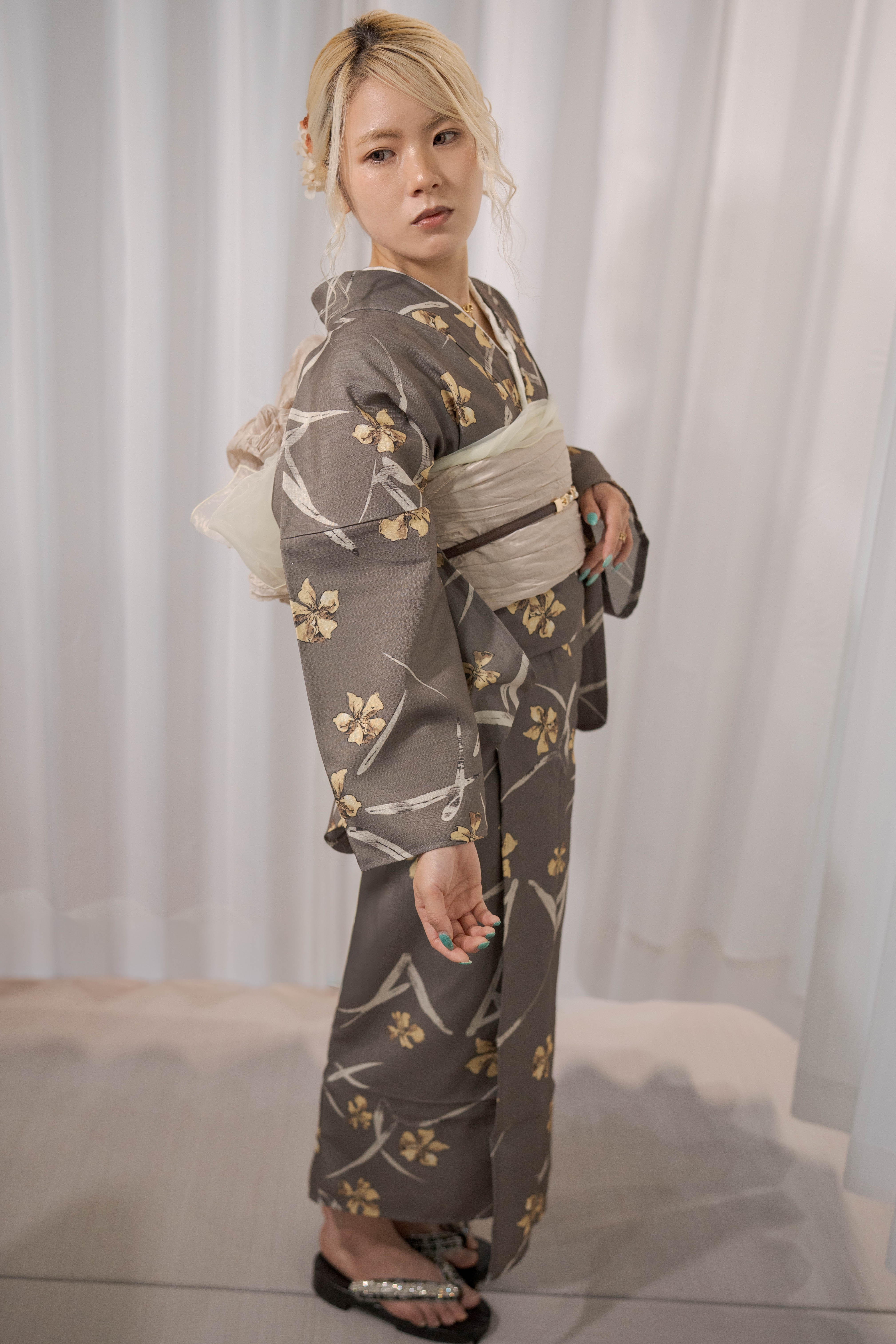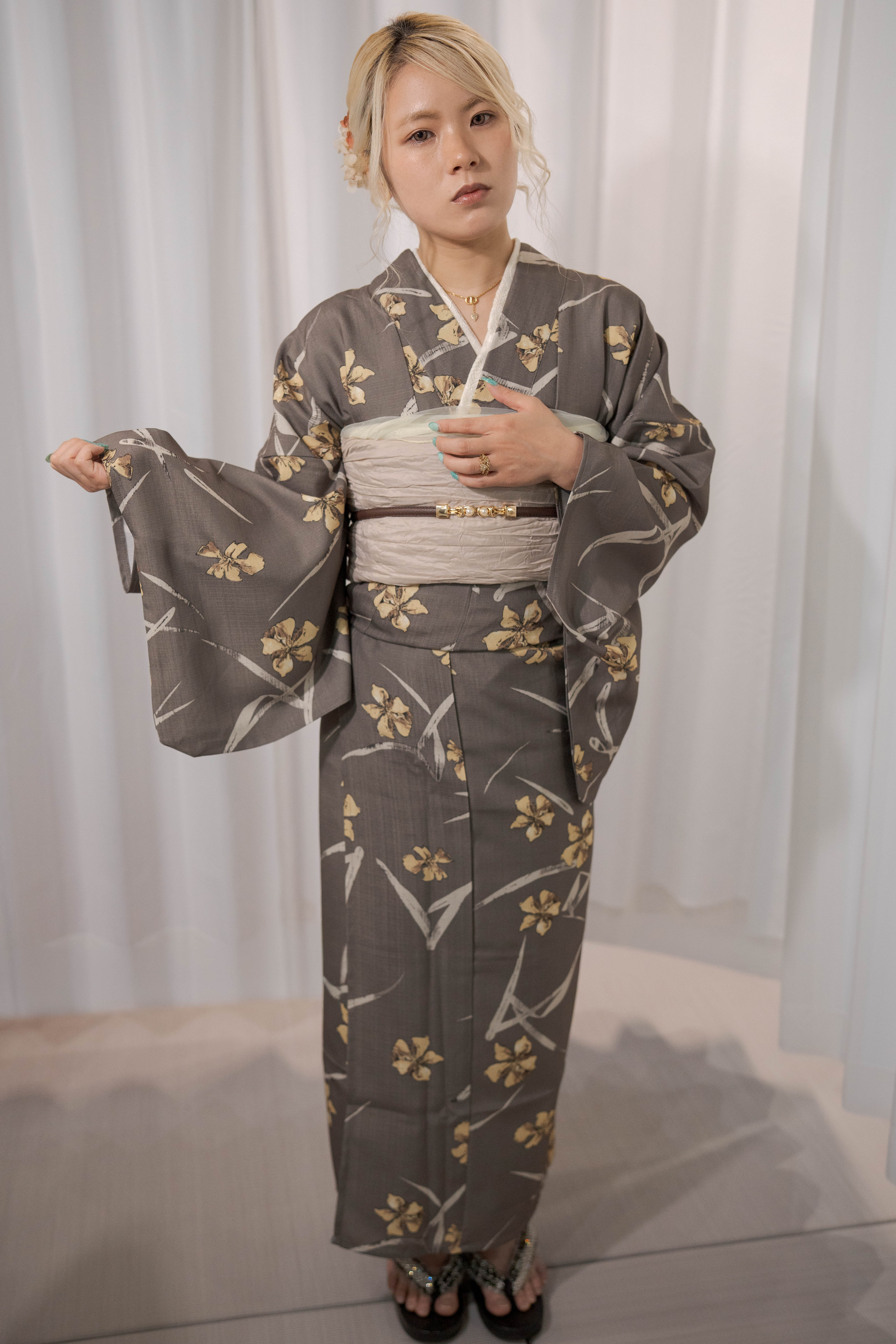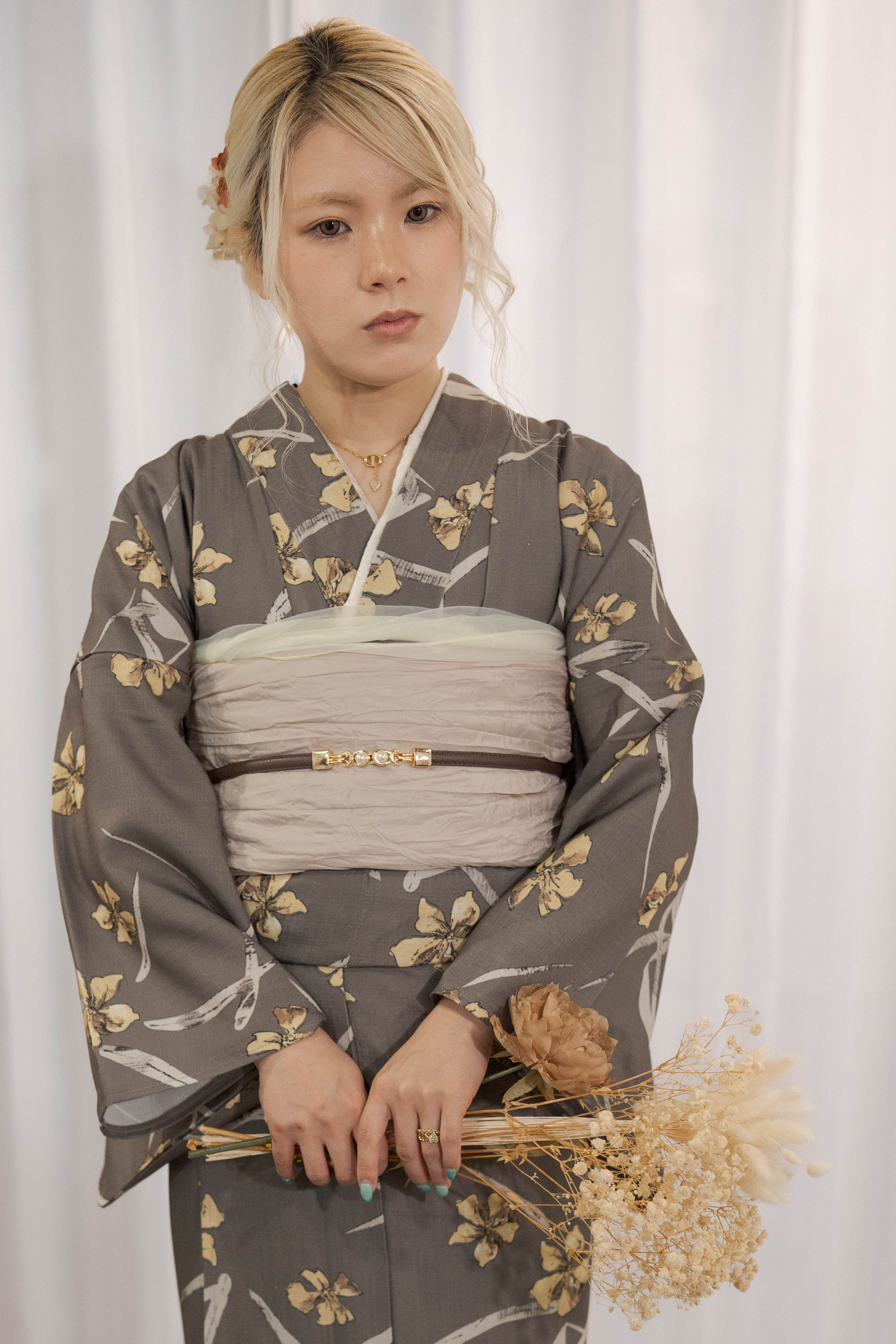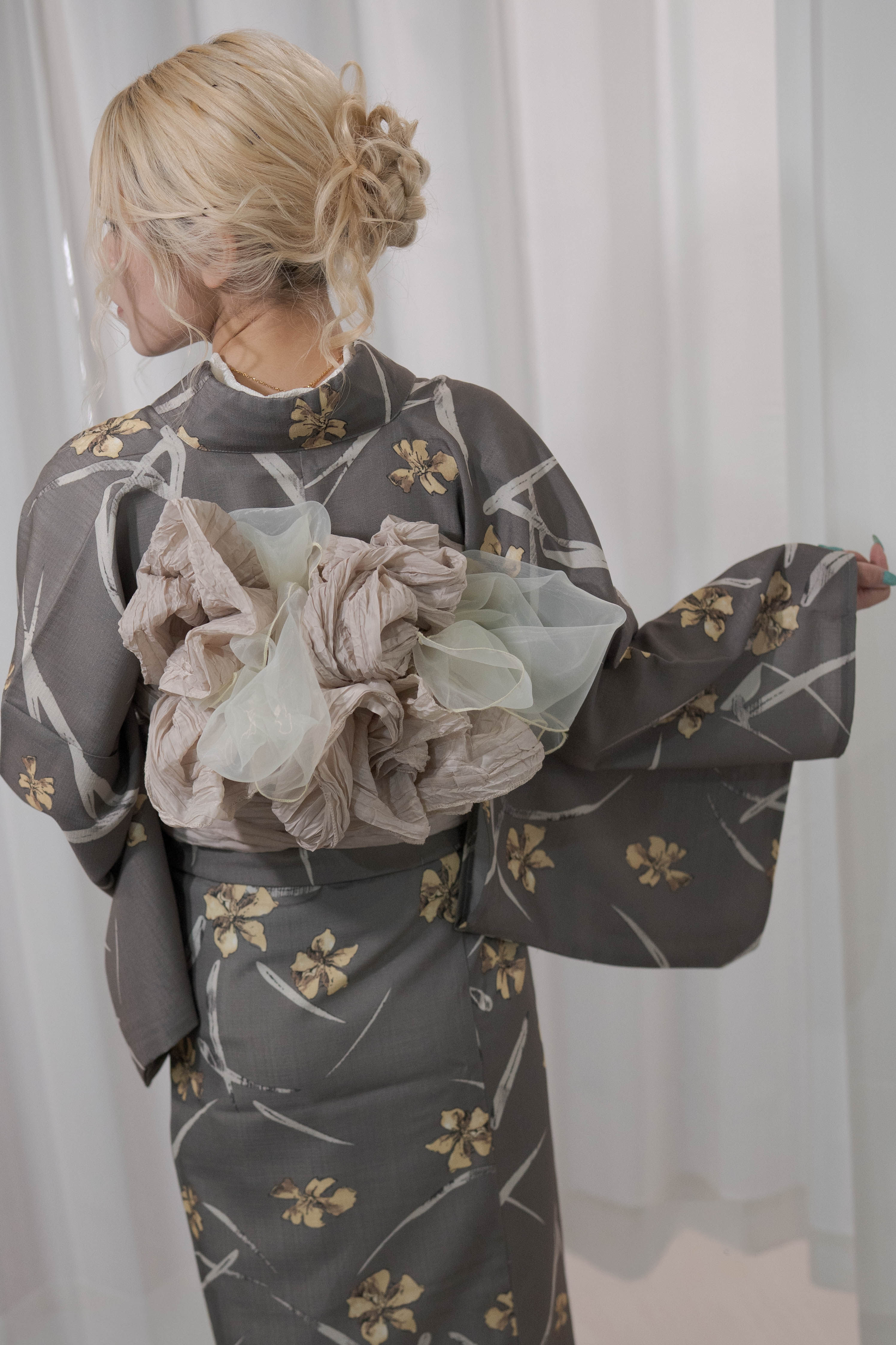 くすんだグレーに淡黄のhs菜が浮かぶ、静かにトーンを揃えた一着。ベージュの帯で質感を重ね、柔らかさの中に芯を残す。甘さによりきらず、あえて引いた色で魅せる大人の余白。