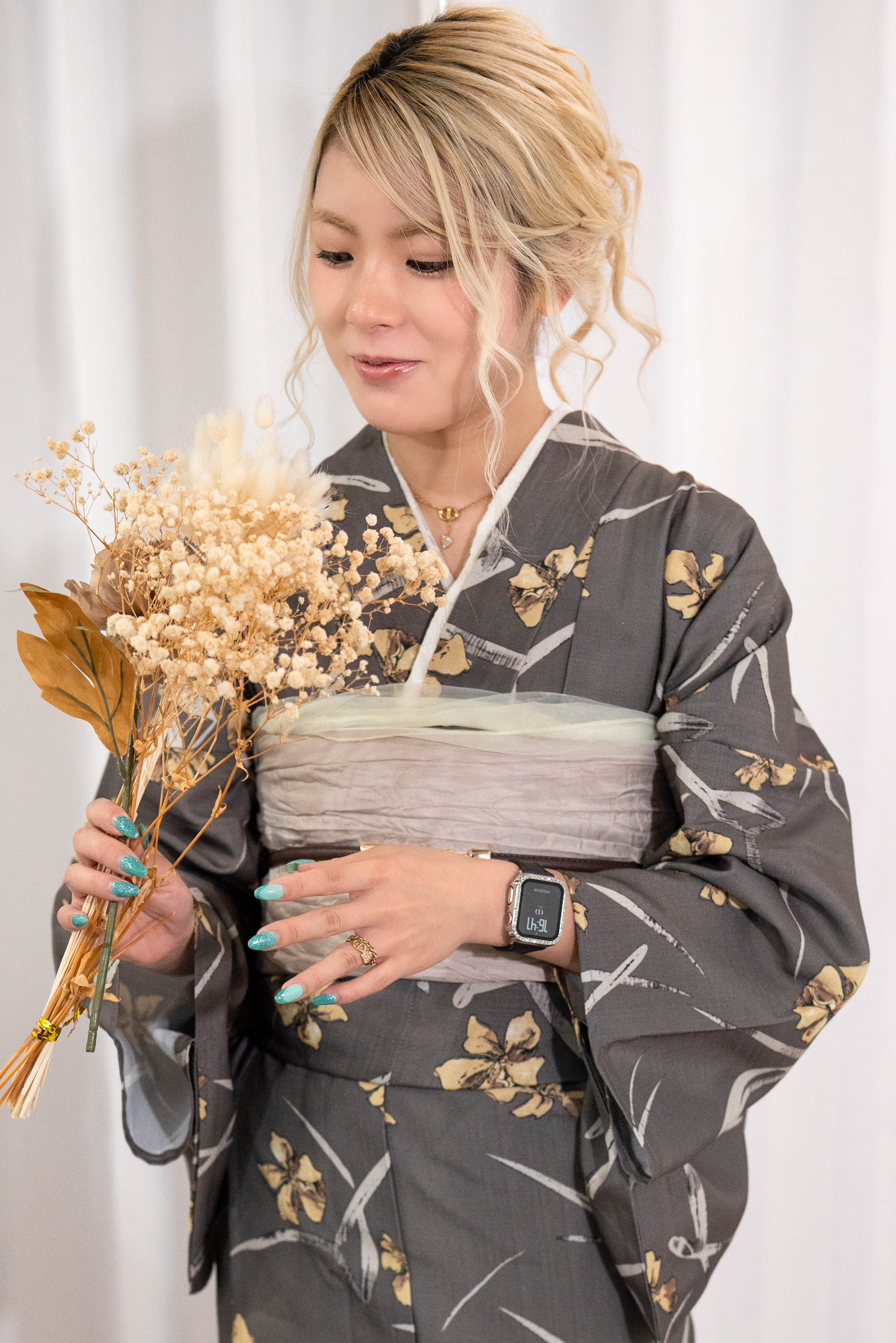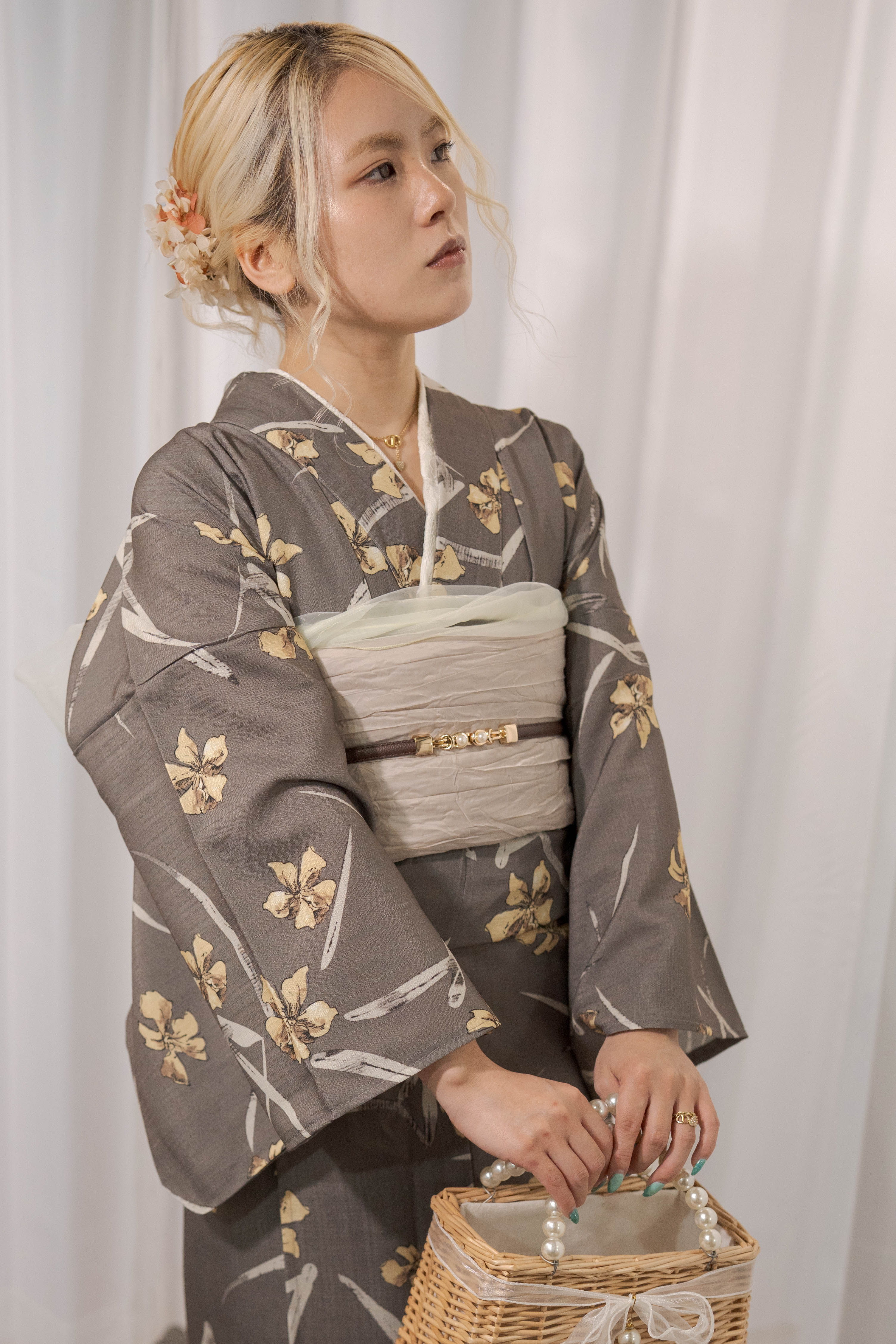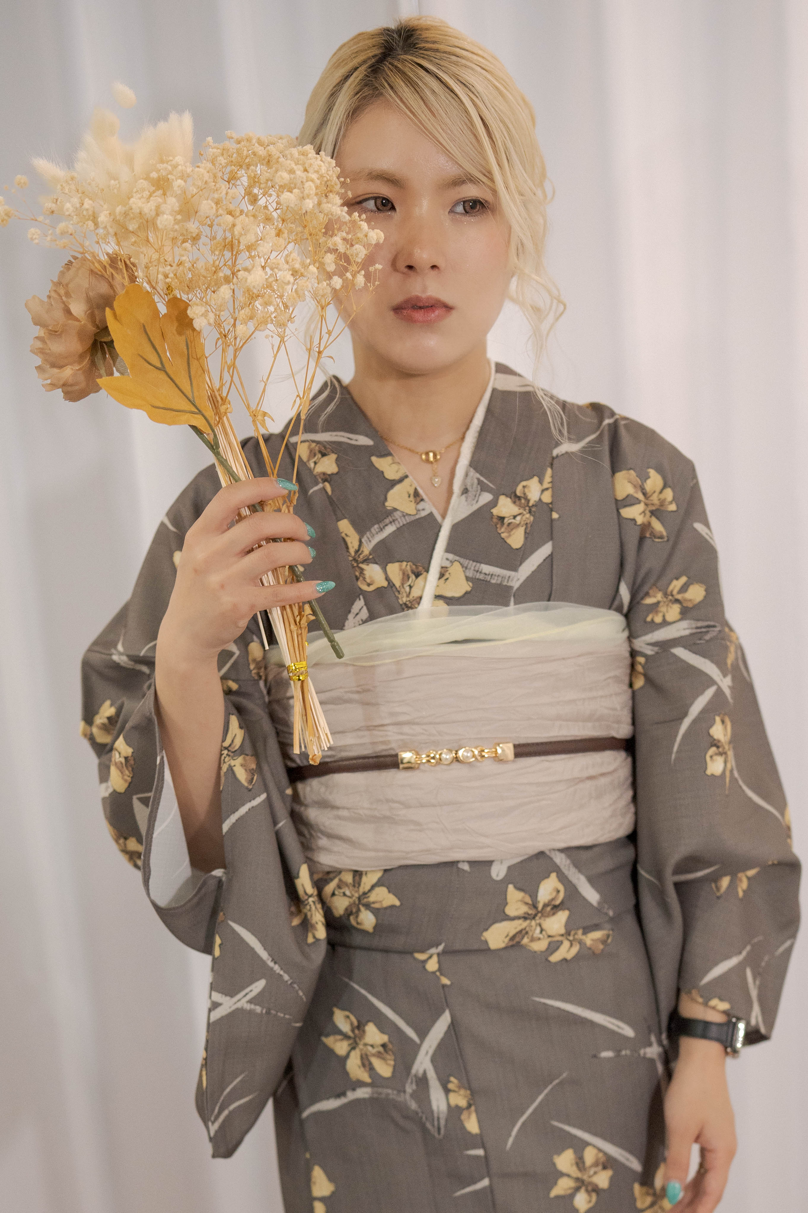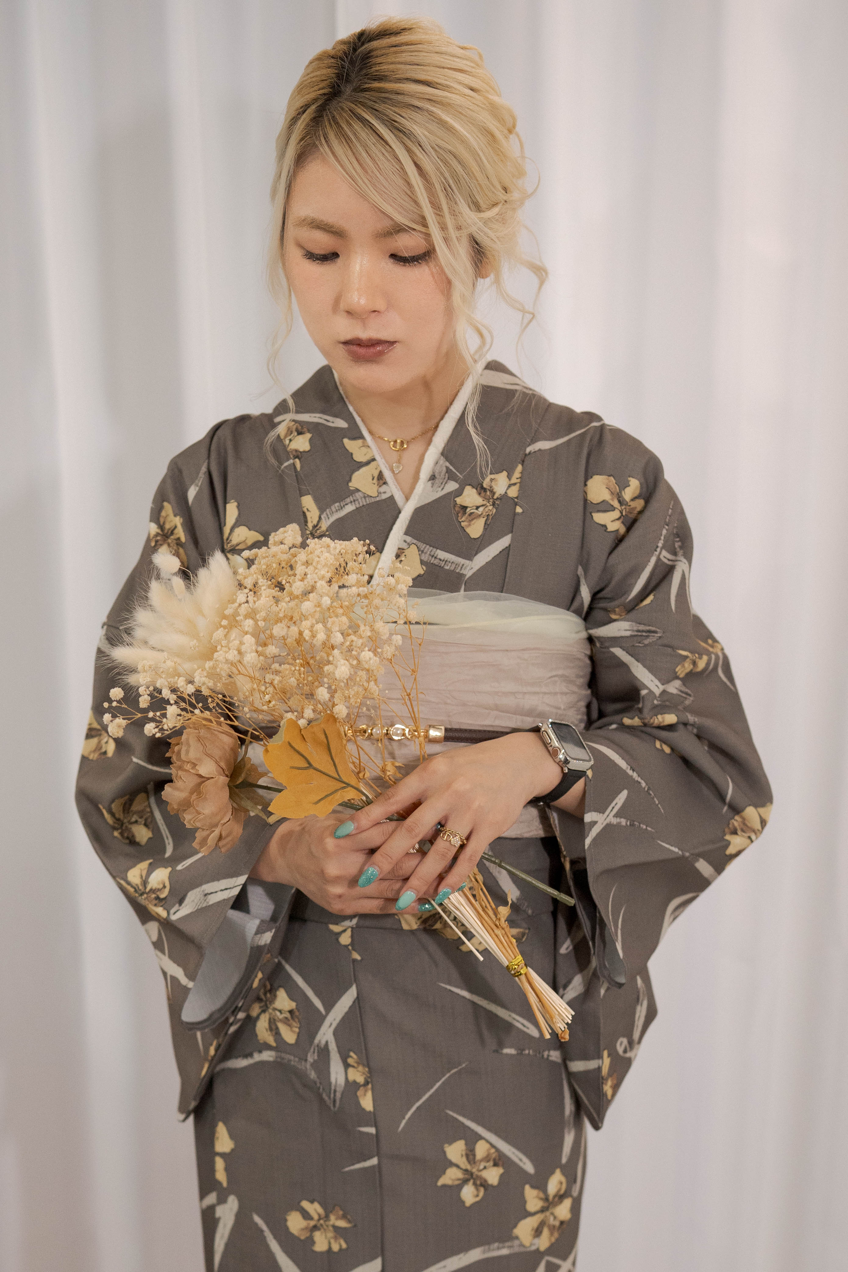 ・浴衣:グレイッシュブラウン地 × くすみイエロー花柄
