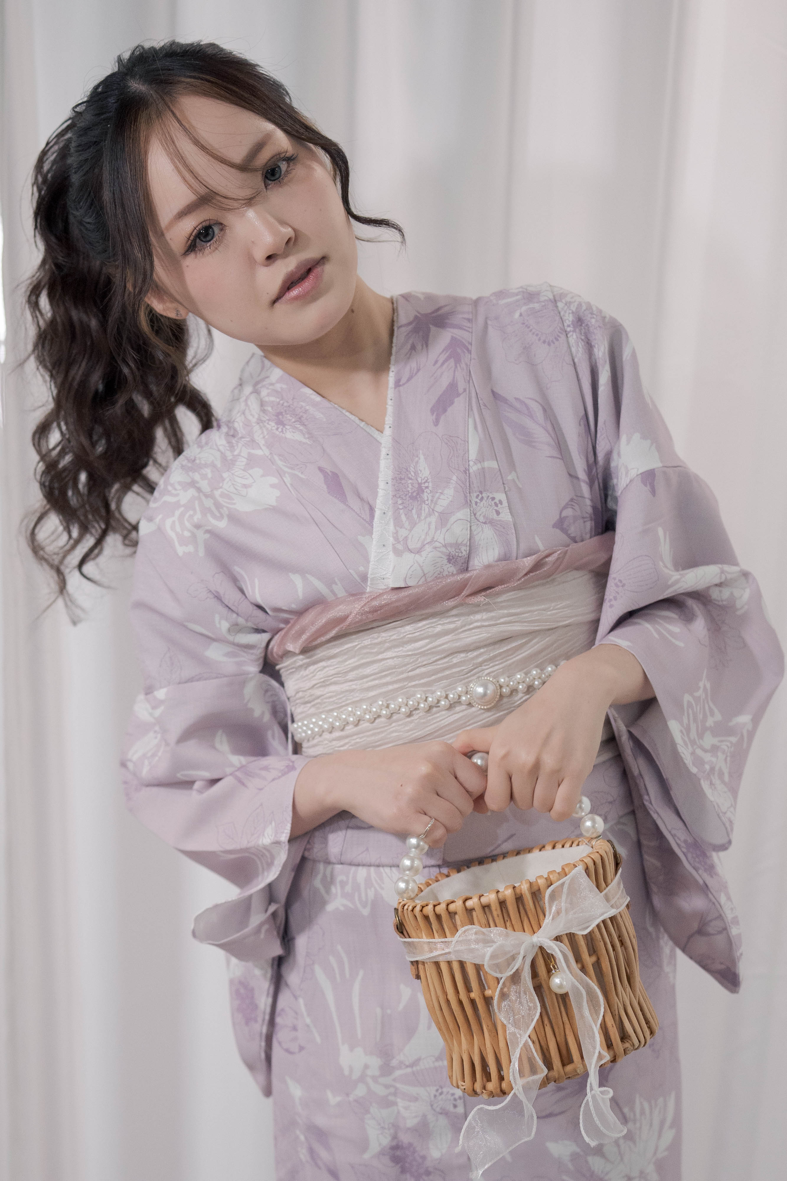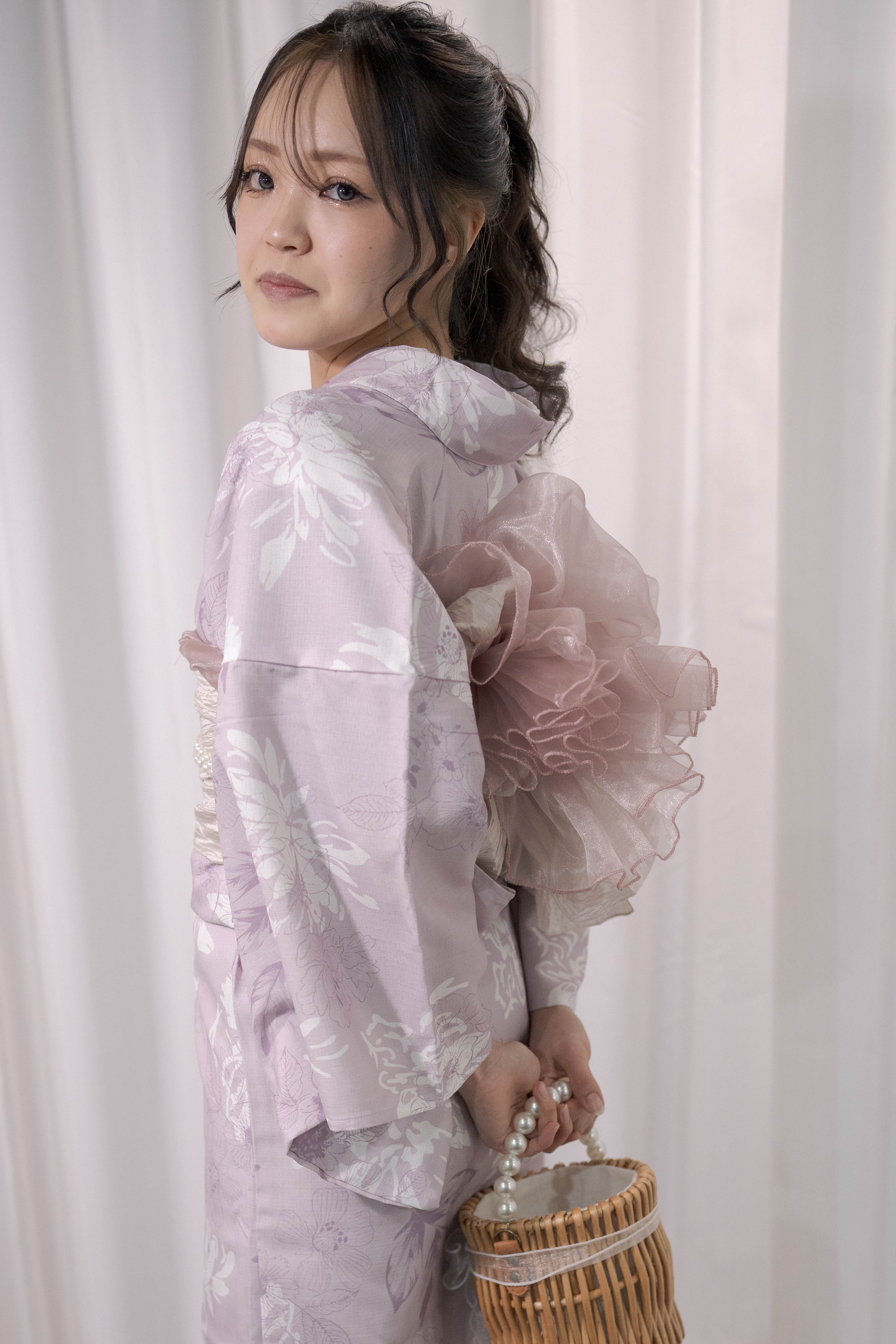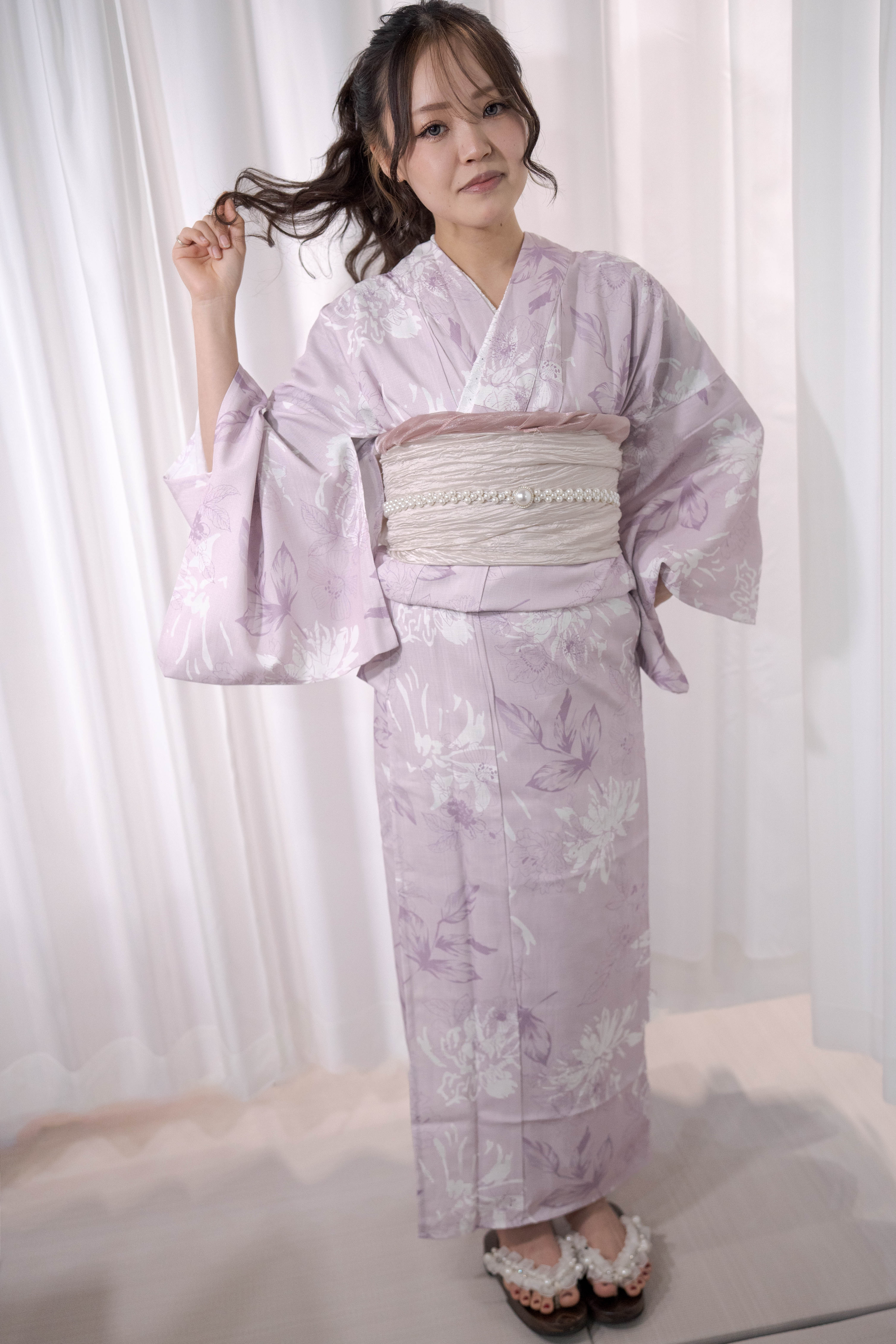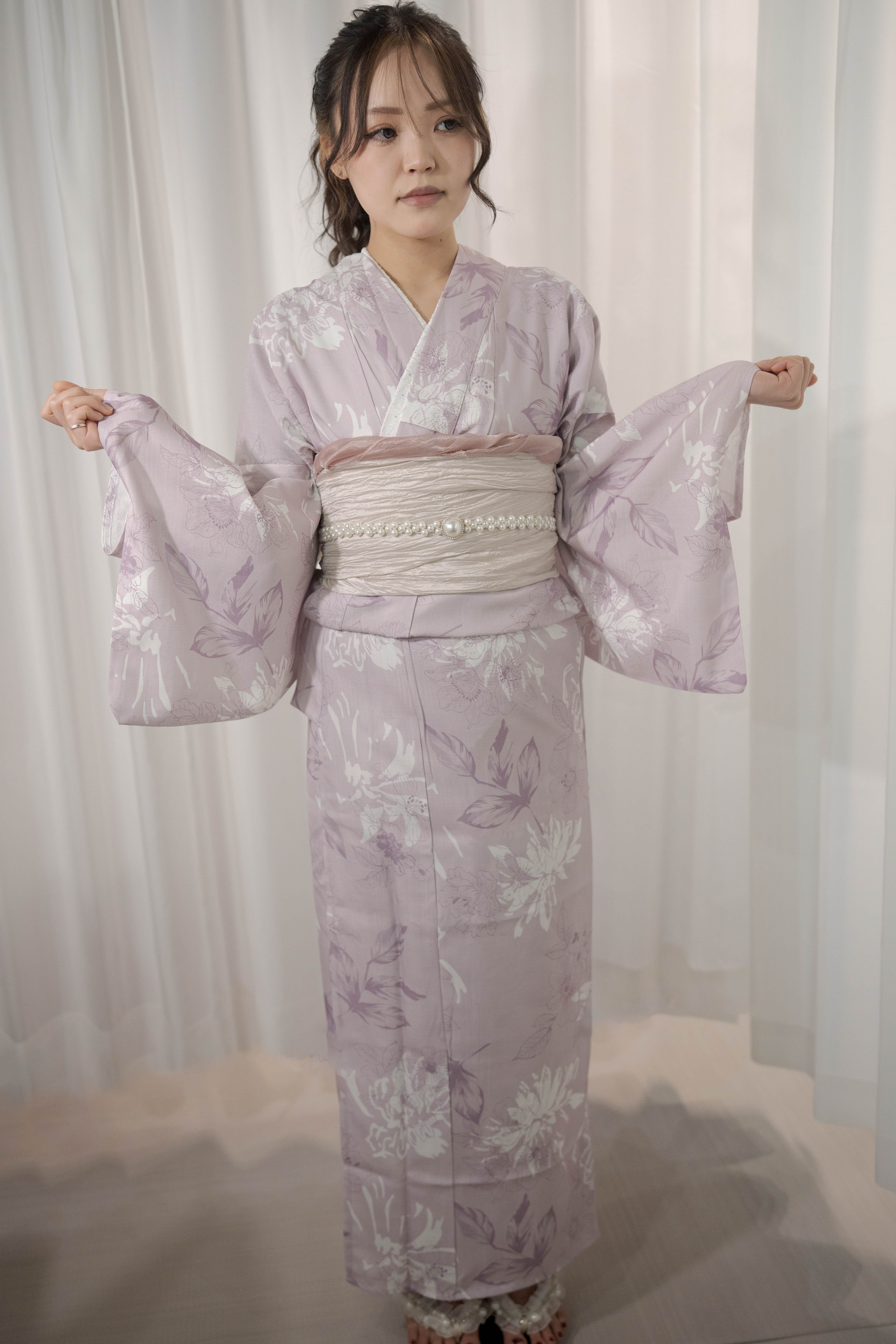 淡い藤色に白を重ねた、やわらかく甘さを含んだ一着。透ける帯と白珠のラインで、軽やかさと上品さをプラスしたほんのり可愛いコーディネート。