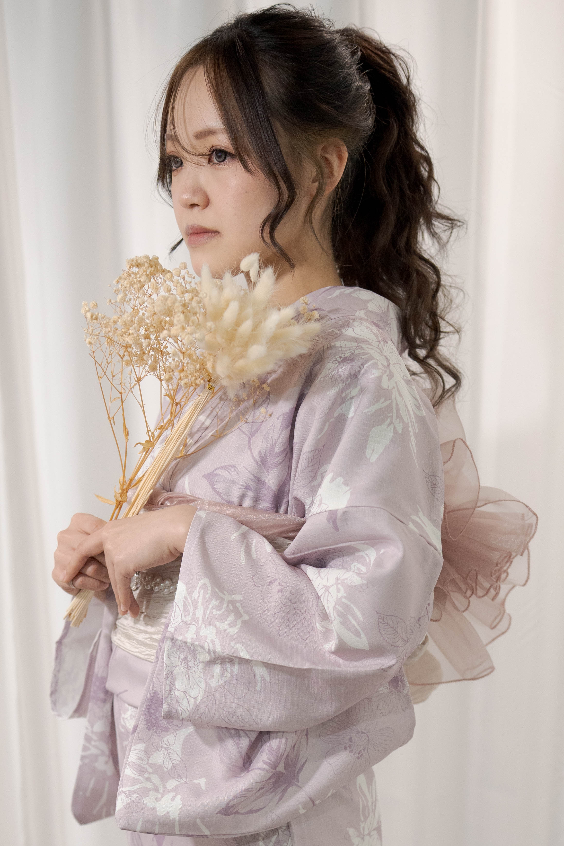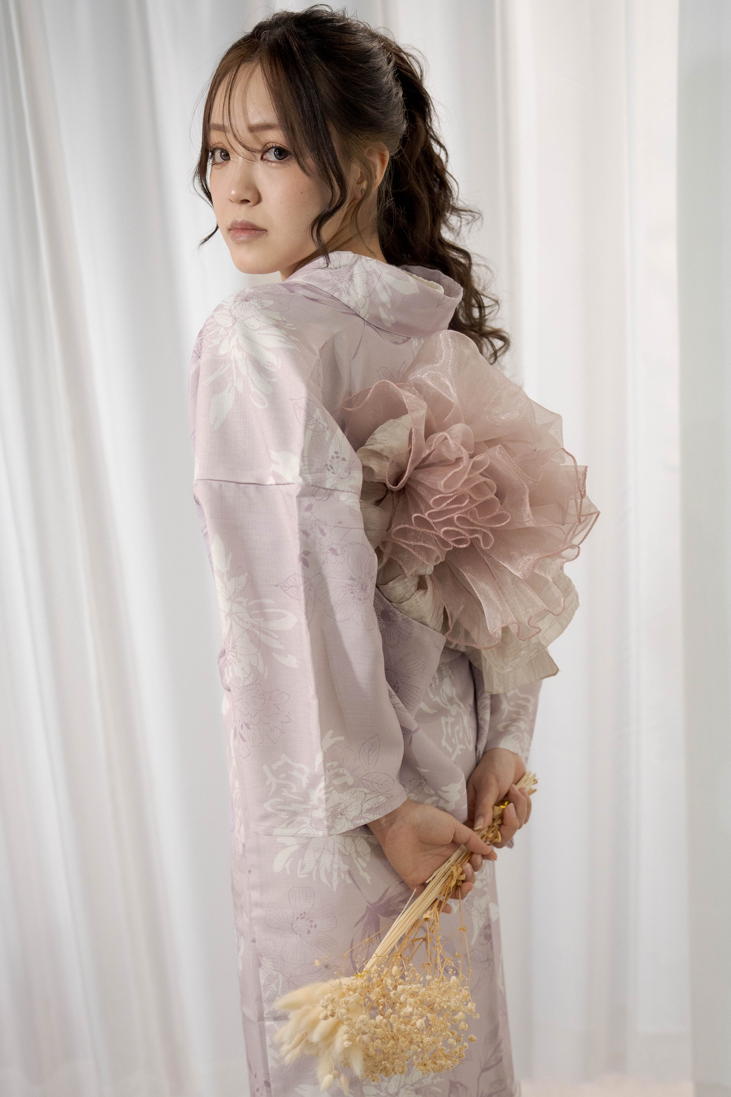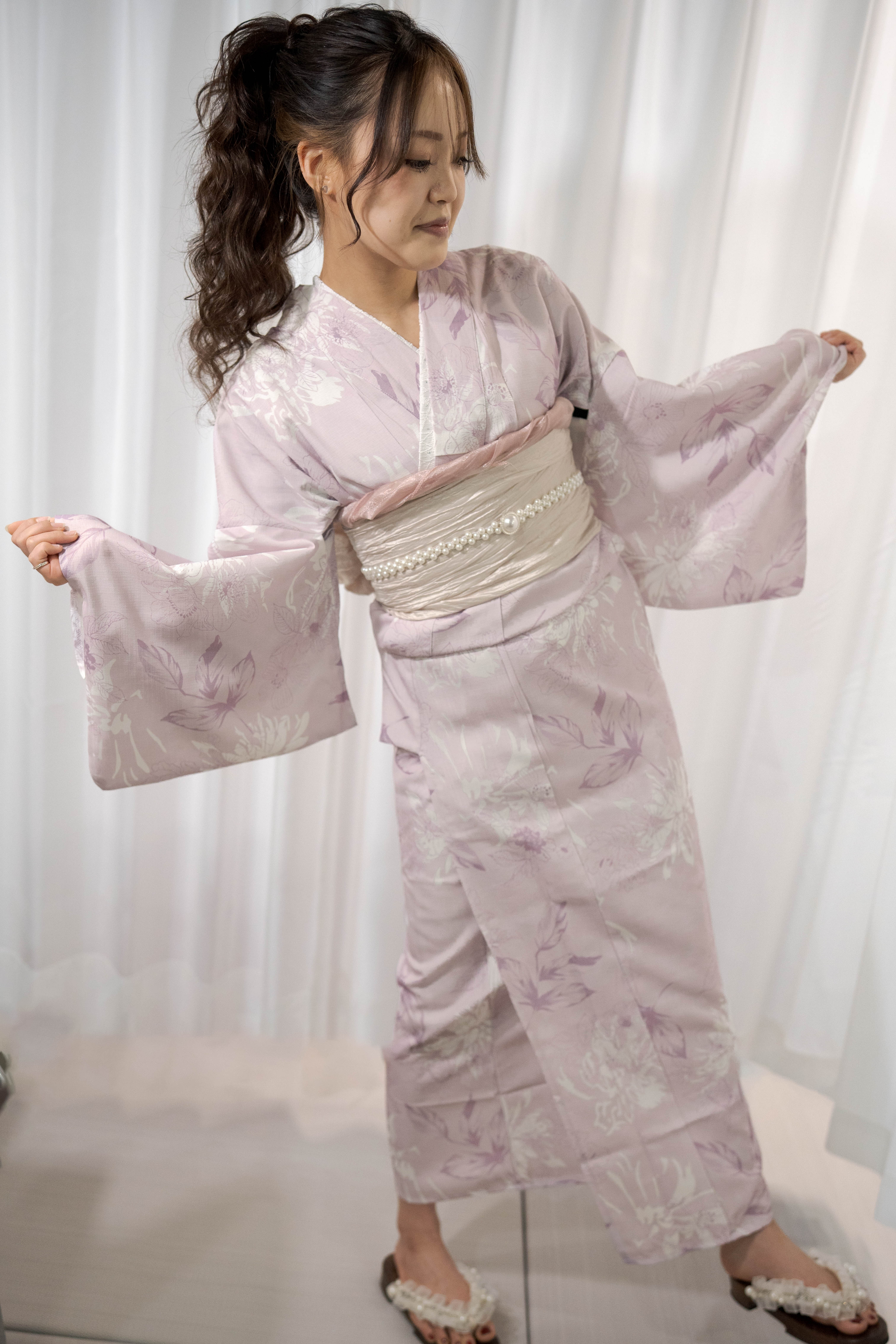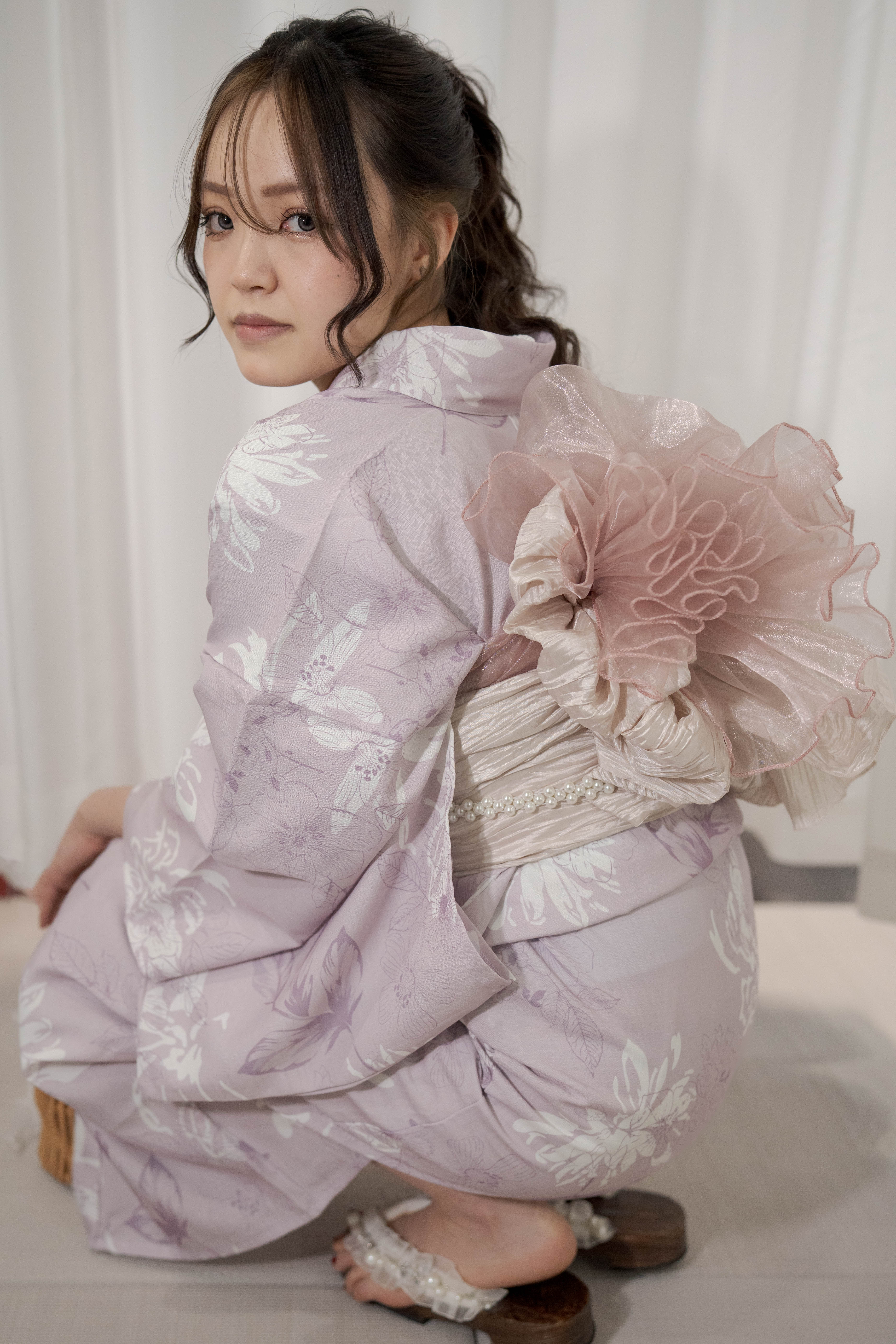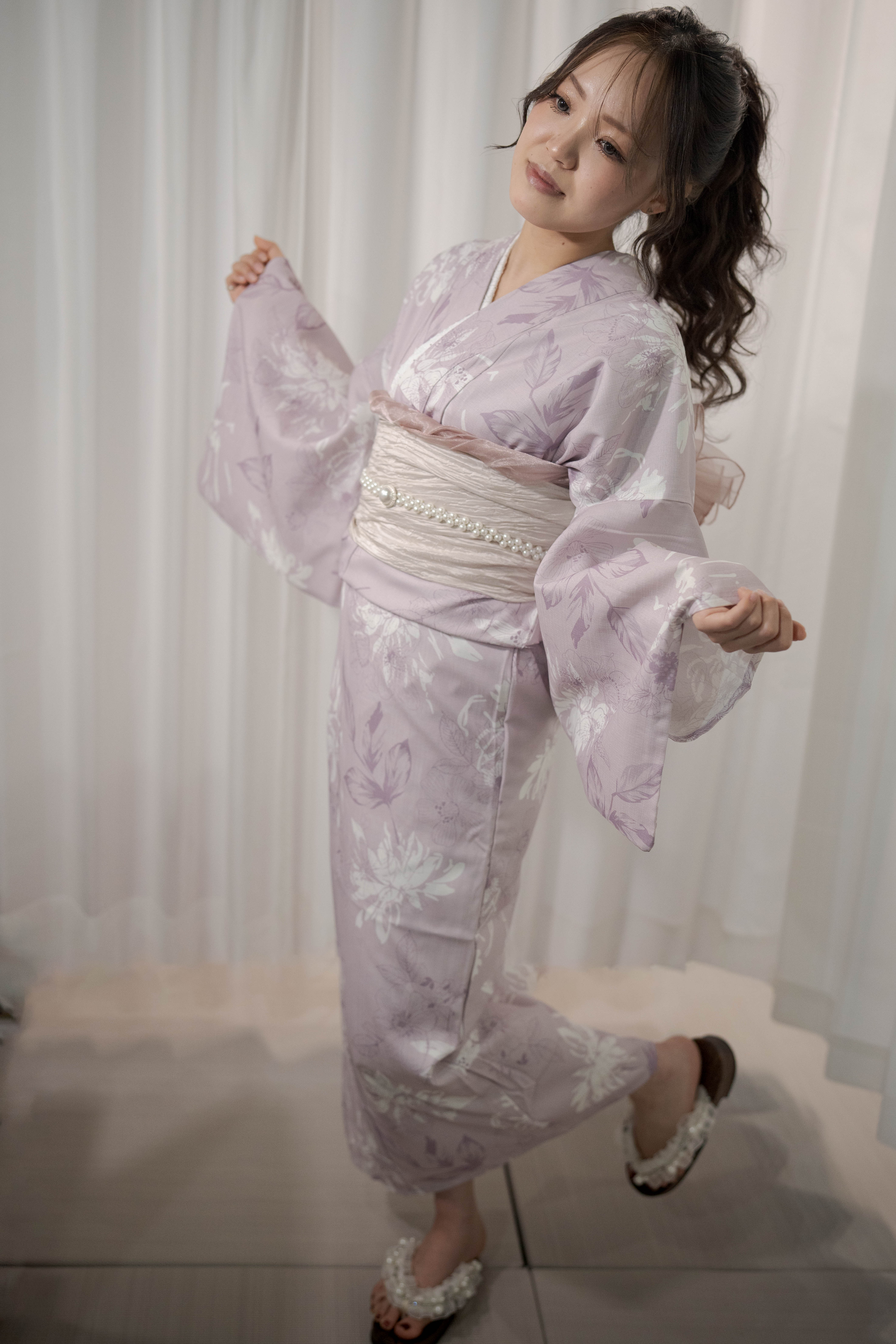 淡い藤色に白を重ねた、やわらかく甘さを含んだ一着。透ける帯と白珠のラインで、軽やかさと上品さをプラスしたほんのり可愛いコーディネート。